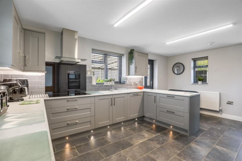 Having base and wall mounted units comprising grey shaker style cupboards and drawers with contrasting work surfaces above and plinth lighting below. Integrated double oven, 5 ring electric hob with extractor hood above, dishwasher, fridge and freezer. 1 1/2 Sink with drainer. Front, side and rear uPVC double glazed windows. Side and rear courtesy doors. Door to...