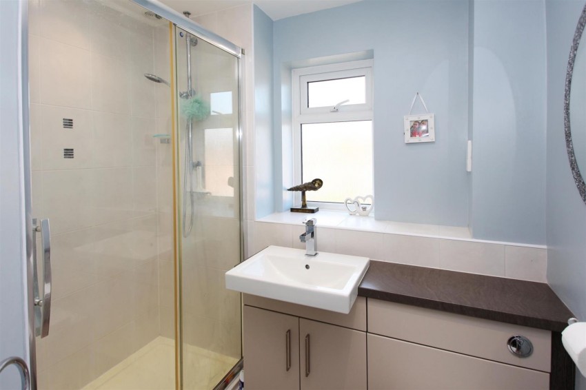 having being refitted with a WC and wash hand basin set into a sleek gloss vanity unit. Double width shower cubicle with thermostatic Aqualisa Quartz digital shower and sliding glass door. Rear aspect patterned glazed window, vinyl flooring and chrome faced ladder radiator.